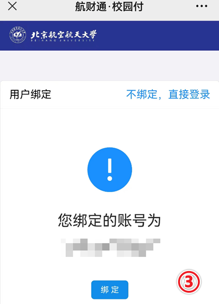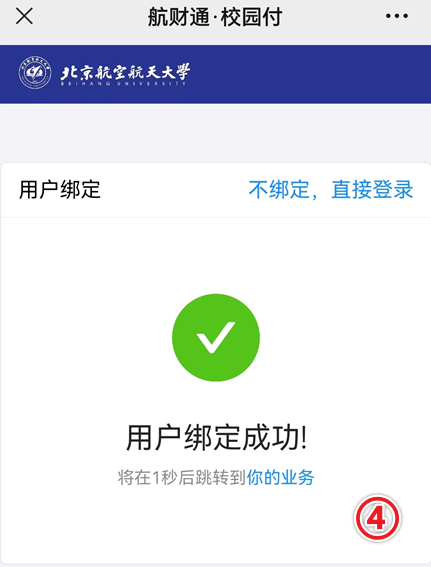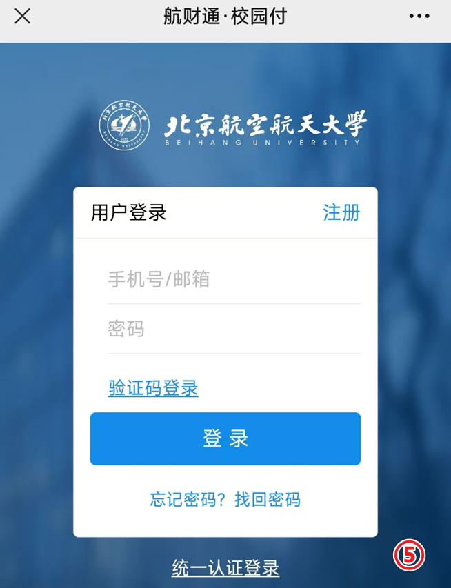 ②除了上述登录航财通的方法,已进行过统一身份认证的北航师生也可以在图1界面点击“不绑定,直接登录”进入图5界面,选择“统一身份认证登录”。登录成功后,系统会自动返回支付界面,今后在公众号付款时将不再弹出此窗口。