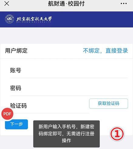 ①首次使用航财通的北航师生/非北航师生可在图1界面输入手机号并设置新密码完成绑定。此操作仅需执行一次,之后在公众号付款时将不再弹出此窗口。(密码要求:密码位数应为6至16位且必须包含大写字母、小写字母、数字、其他符号四类中的至少两类)
