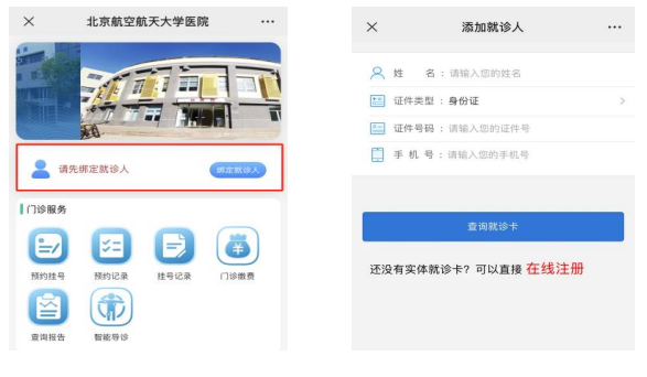 1、点击系统上方“请先绑定就诊人”,输入姓名、证件号码、手机号后查询就诊卡,确认姓名以及患者类型(公费医疗/医保/自费)无误后即可绑定。