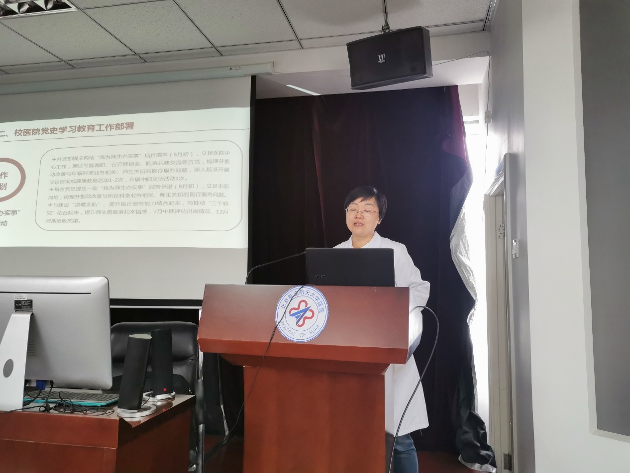 高静书记对医院全年的党史学习教育工作进行部署,动员全体党员要深入学习党的历史,做到学史明理、学史增信、学史崇德、学史力行,立足医疗本职开展“我为师生办实事”实践活动,将党史学习成果切实转化为提高医疗服务质量的具体行动,提升师生的满意度和幸福感,以优异成绩迎接建党100周年。