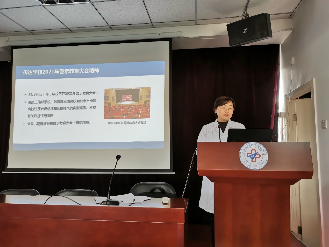 2021年12月10日,校医院开展全院作风建设教育大会,党总支书记高静带领大家学习习近平总书记关于机关作风建设的重要讲话精神,解读国家最新制定的《医疗机构工作人员廉洁从业九项准则》,并结合全国医疗机构及其工作人员廉洁从业2021-2024年行动计划,学习开展医疗行业作风教育主要内容。